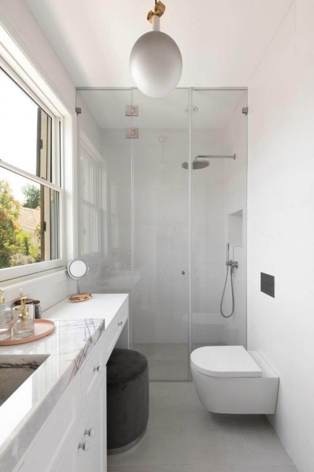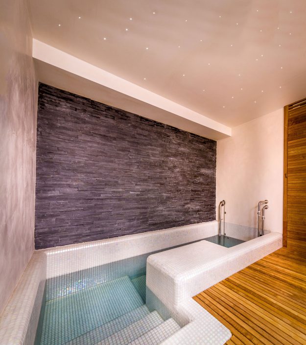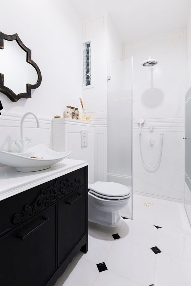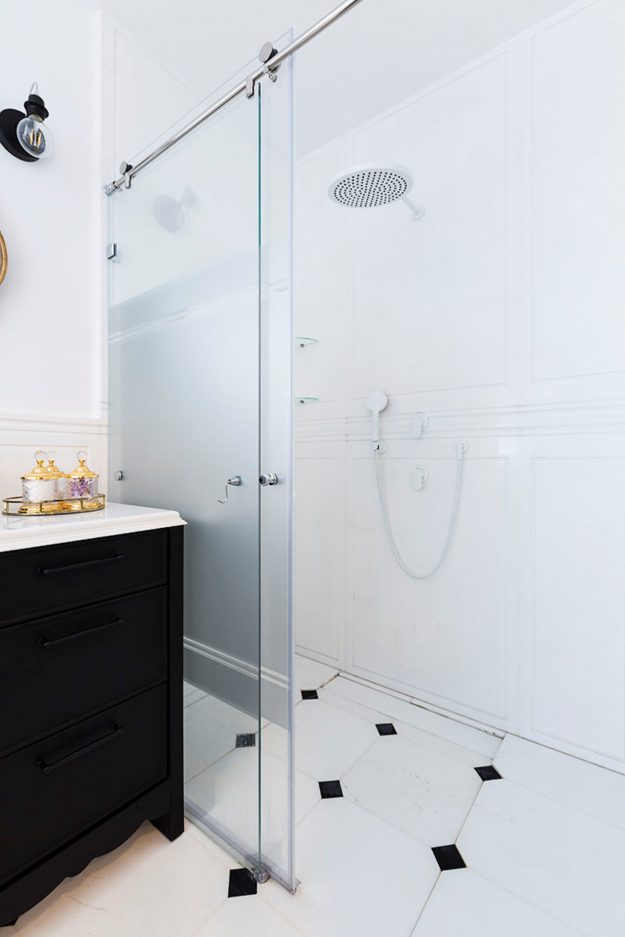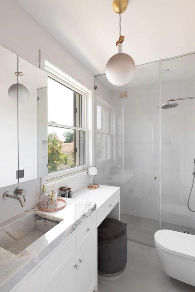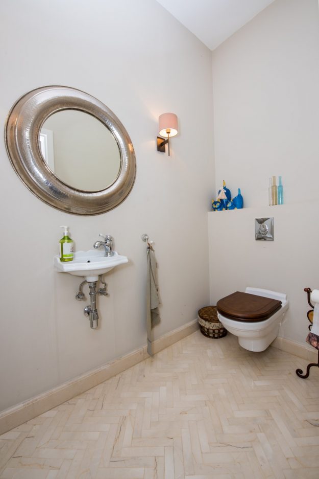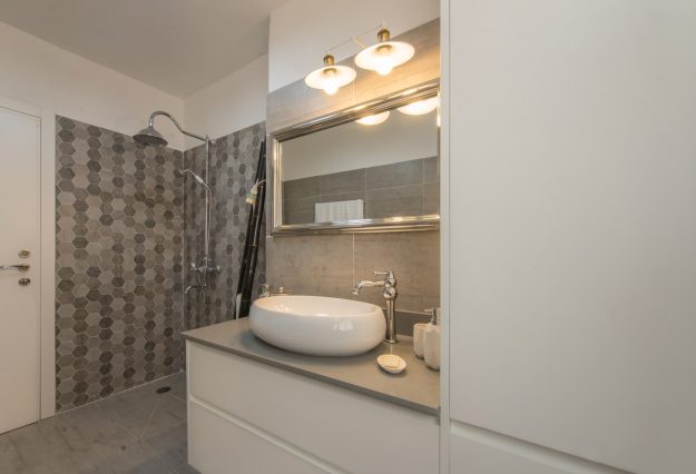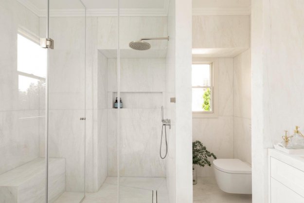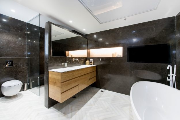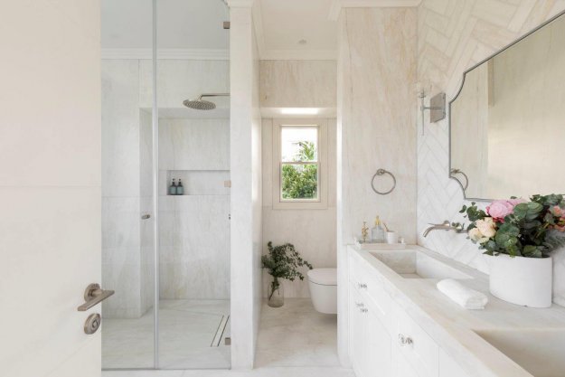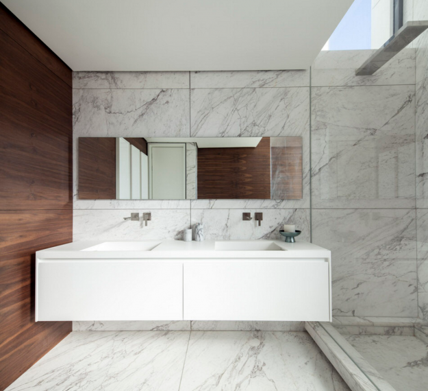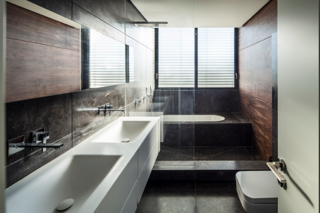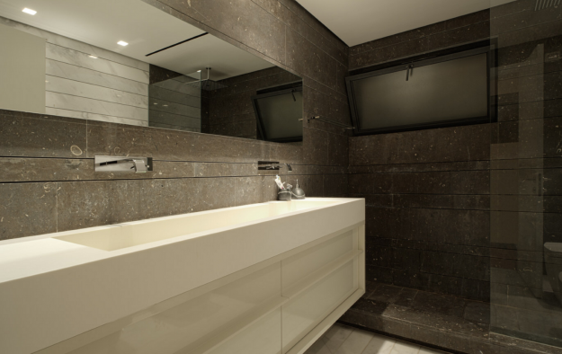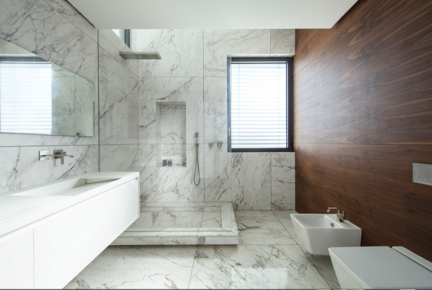חיפוי השיש על גבי כל המשטחים יוצר תחושה של היכל רחצה רחב ידיים, מפואר ומפנק.