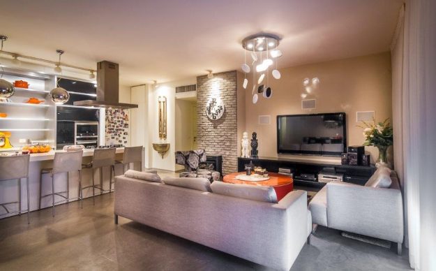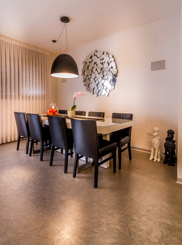 פרויקט בסגנון מודרני קלאסי המשלב בריקים אבן טבעית אפורים, ריצוף פנים המכונה: בטיש אזול מדמה בטון מוחלק. היתרונות על פני הבטון כמו בכל אבן תמיד ניתן לחדש ע"י ליטוש והחומר אינו נוטה להתפוצץ כמו בטון.
