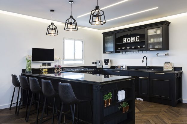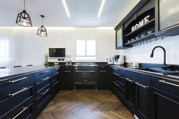 מטבח בסגנון ויטנג' עם נגיעה דרמטית של גוון שחור המבליט את כל מה שעומד סביבו.
