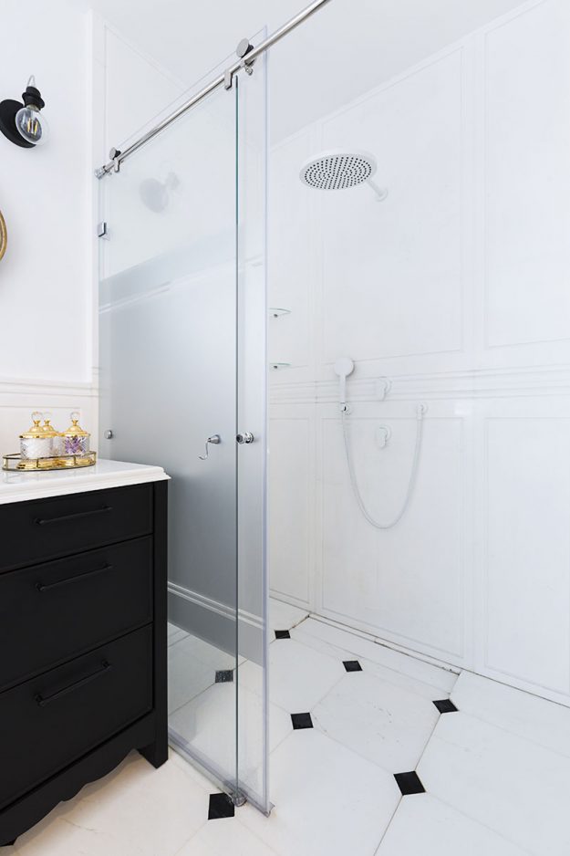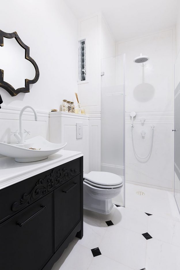 חדרי אמבטיה בסגנון המאה העשרים. אבנים בחיתוך יהלום שחור לבן.