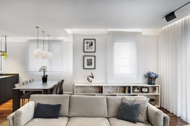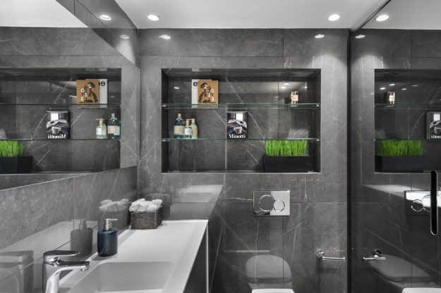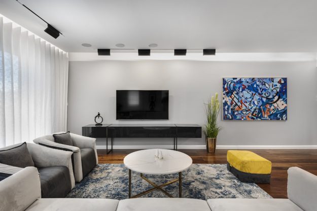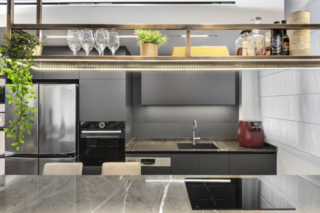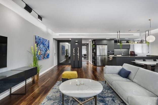 באחד הפרויקטים היוקרתיים בתל אביב, השוק הסיטונאי של גינדי. דירת קבלן בת ארבעה חדרים שופצה מהיסוד והוסבה לדירת שלושה חדרים מרווחת. הגוונים השולטים בדירה כל גווני האפור, זהב וכחול. הדירה עברה שינוי טוטאלי, הוגדל האזור המרכזי ונבחרו חומרי גמר ברמה גבוהה מאוד. תקרת הדירה הונמכה בגבס לצורך העברת תשתיות תאורה, מערכת אודיו ומערכת המיזוג. כדי לאזן ולהכניס חום לעיצוב המונוכרומטי נבחר פרקט אגוז אמריקאי שהותקן על גבי הריצוף הקיים. המטבח בגוון אפור גרפיט עם בר מרחף ומשטח שיש גריי מרקווינה. מעל לאי מדף מרחף מברזל בגוון פליז מושחר עם תאורה היקפית לטובת הנחת בקבוקי אלכוהול וכוסות יין. פרטי הריהוט נבחרו בקפידה, חיפוי הקירות ופרטי הנגרות תוכננו בהתאמה במיוחד לבית. כיאה לדירה גברית, חדרי הרחצה דרמטיים וכהים מחופים שיש, בהם ארון כיור עם משטח קוריאן וכיור מובנה. בשירותי האורחים הותקן ארון שירות גדול עם דלתות מראה כהה בקו אפס. בעל הבית מאוד אוהב אומנות וככזה אספן אומנות נלהב כל פרטי האומנות והפסלים יוצרו בהתאמה אישית ובמיוחד לכל פינה בבית ותרמו להשלמת התמונה הכללית.